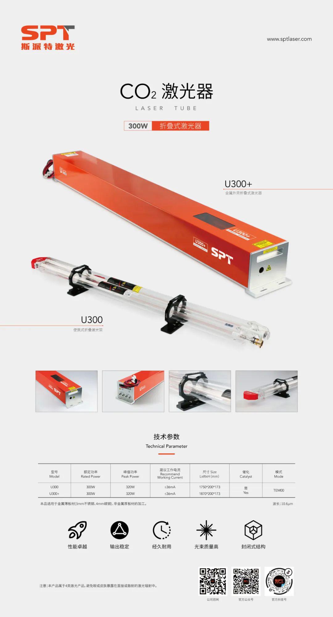 SPT斯派特激光將攜CO2射頻激光器和CO2激光管亮相此次展會。其中,此次在展會中展示的U系列CO2激光器,采用了雙管并聯折疊方式,延長諧振腔,提高光電轉換率。在輸出更穩定、使用更安全的同時,實現更大功率, 適用于大功率切割 。
