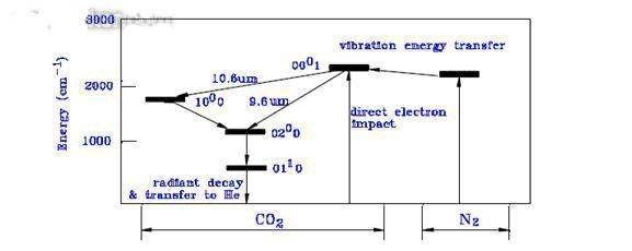 二氧化碳激光是一種分子激光。主要的物質是二氧化碳分子。它可以表現多種能量狀態這要視其震動和旋轉的形態而定?;镜哪芰烤W狀見圖1。二氧化碳里的混合氣體是由于電子釋放而造成的低壓氣體(通常30-50托)形成的等離子(電漿)。如麥克斯韋-波爾茲曼分布定律所說,在等離子里,分子呈現多種興奮狀態。一些會呈現高能態(00o1)其表現為不對稱擺動狀態。當與空心墻碰撞或者自然散發,這種分子也會偶然的丟失能量。通過自然散發這種高能狀態會下降到對稱擺動形態(10o0)以及放射出可能傳播到任何方向的光子(一種波長10.6μm的光束)。偶然的,這種光子的一種會沿著光軸的腔向下傳播也將在共鳴鏡里擺動。
