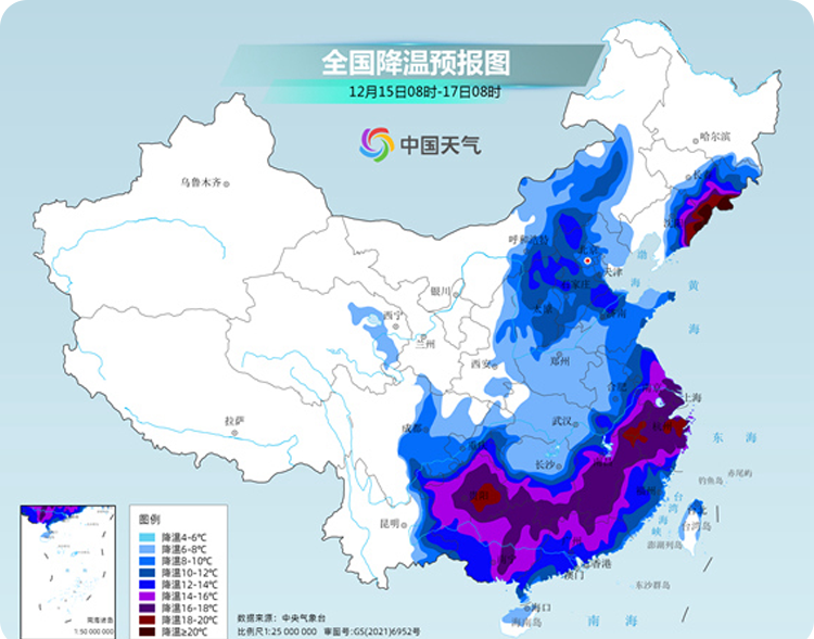 12月16日至17日,強寒潮將影響我國中東部大部地區,華北、黃淮北部等地的部分地區最低氣溫將接近或跌破歷史同期極值,南方將現冷暖大逆轉,江南等地不少地方氣溫將累計下降20℃左右,請各位注意添衣,謹防感冒。