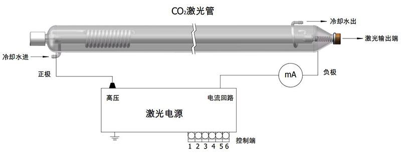 激光電源的高壓(HV+)必須與二氧化碳激光管的陽極(全反射端)相連。激光電源的電、回路通過一個電流表(或直接)與二氧化碳激光管的陰極(激光輸出端)相連。
