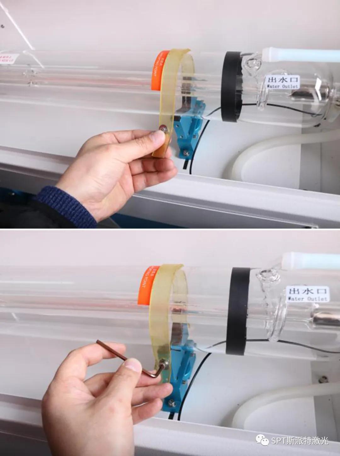 注意:為防止光路變化,保持與拆卸之前的位置一致,激光管的LOGO標簽朝上放置,激光管的兩個支撐點要在激光管總長1/4的點上。