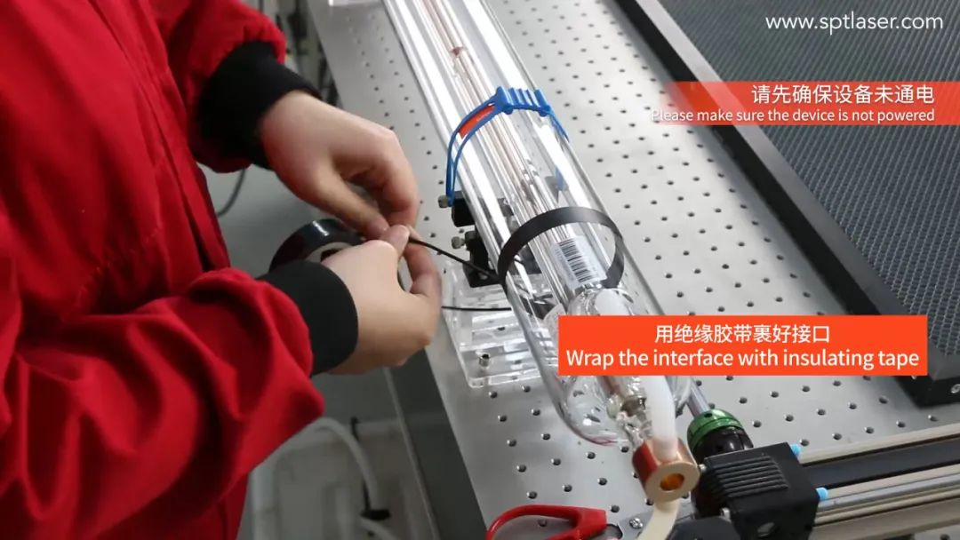 將激光管的高壓線連接激光電源的高壓線,用絕緣膠帶裹好接口并塞入快接接頭的管中。